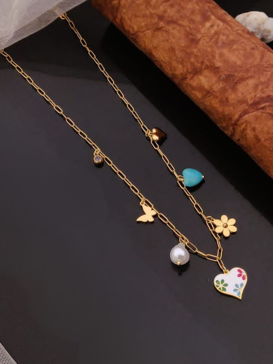 Add fun and flair to your look with this multicharm necklace featuring enamel heart, butterfly, pearl, and floral accents. Lightweight and gold-plated, it’s a perfect pick for gifting, casual wear, and Korean-inspired fashion. Trendy choice for Indian girls & teens.