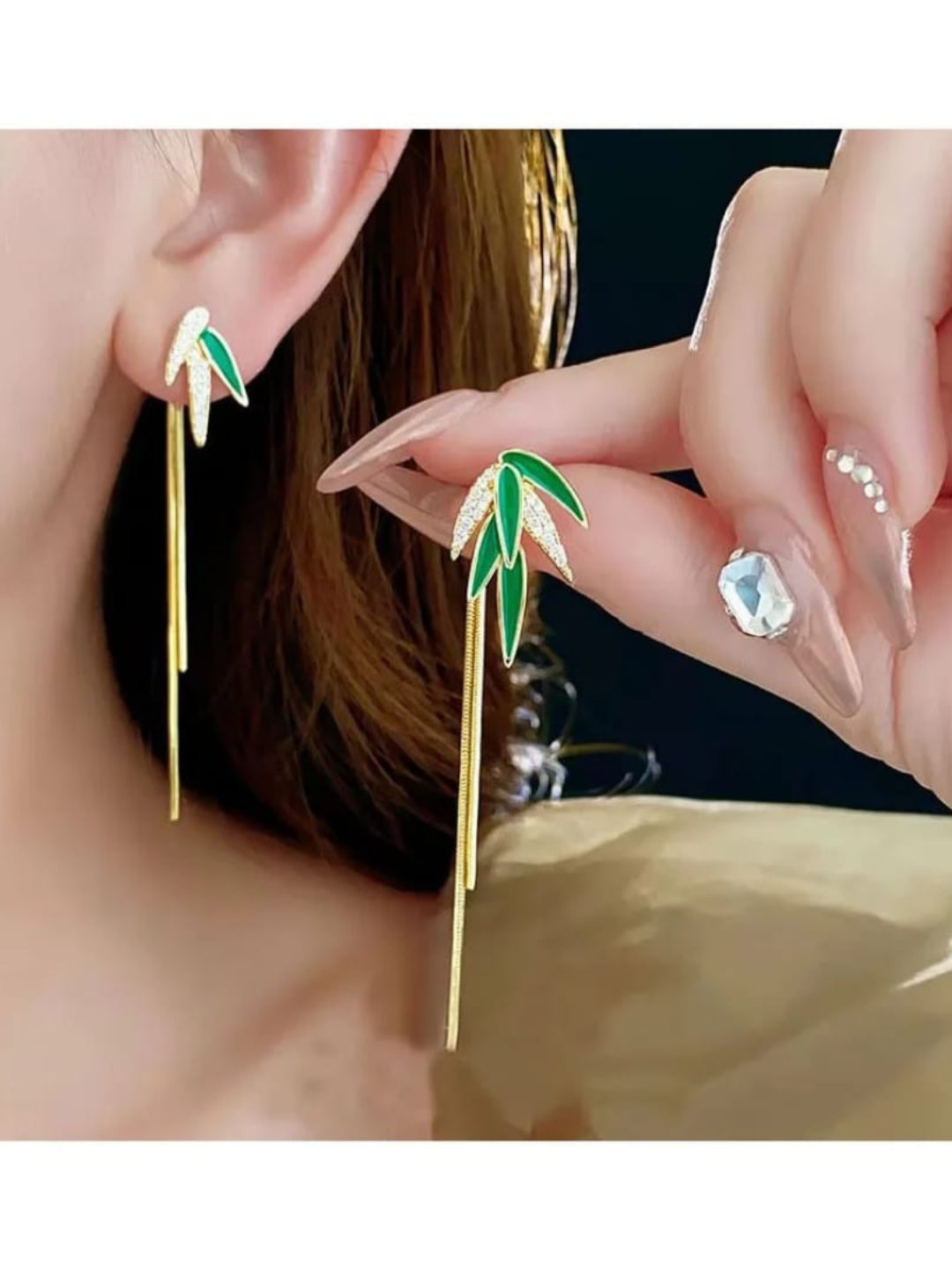 Bring a fresh and elegant vibe to your look with these leaf-inspired chain drop earrings, featuring sparkling accents and glossy green enamel detailing. The sleek gold-tone chain adds graceful movement, making them perfect for festive wear, parties, or stylish daily outfits. Lightweight and trendy, these earrings offer a perfect balance of nature-inspired charm and modern sophistication.