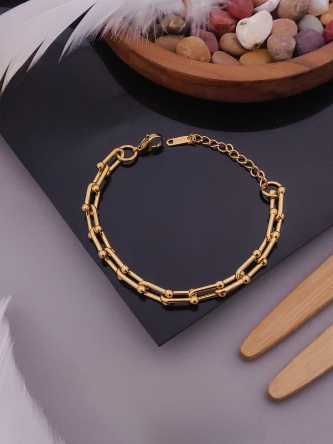 A sleek and stylish gold-plated chain bracelet with a unique linked design. Lightweight, anti-tarnish, and adjustable — perfect for daily wear, office, or festive occasions.